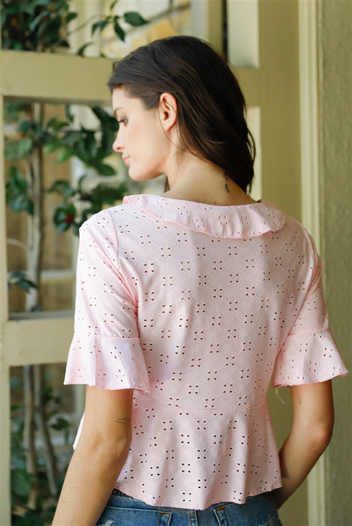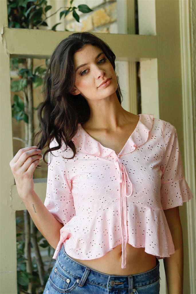 solid color, embroidered, self-tie front detail, collared, v-neckline, flare sleeves & hem, short sleeves, cropped length, unlined, semi-stretchy, non-sheer, casual, cute, girlish, chic, summer vibe