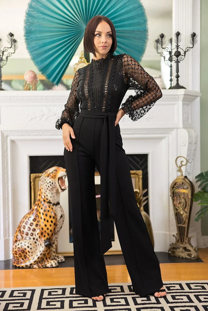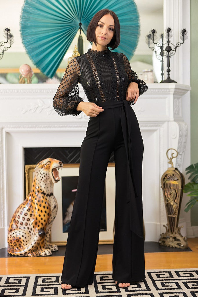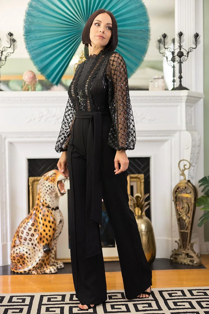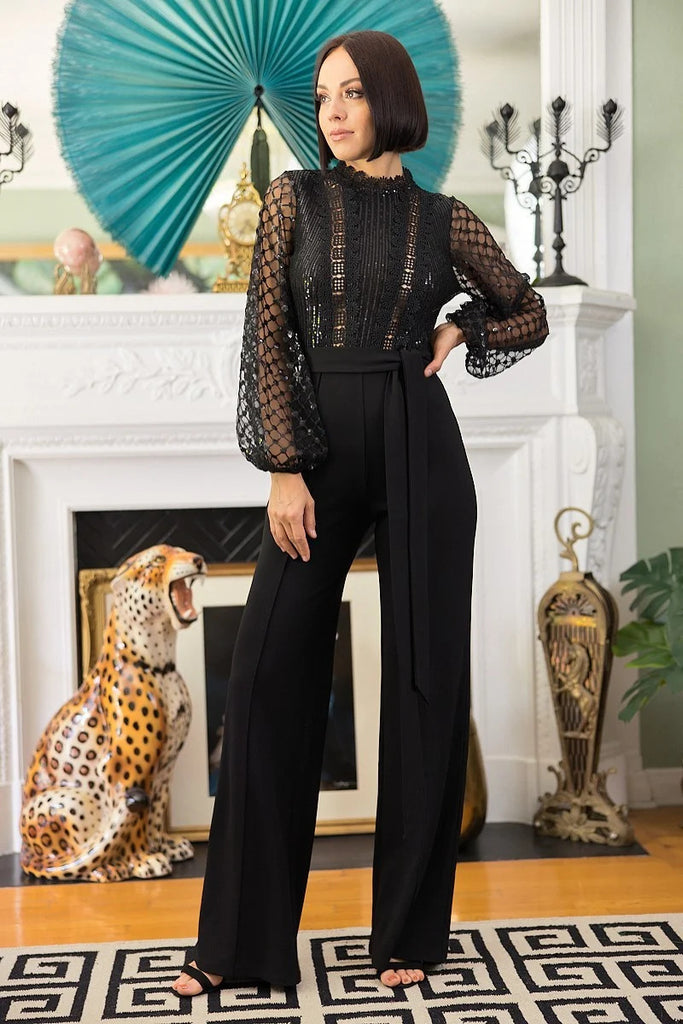 Crochet, Sheer Mesh Sequined Polka dot Jumpsuit. Crochet Mock Neck, Sheer Mesh Sequined Lantern Sleeve. Wide Leg Design, Tie-side, Zipper on Back